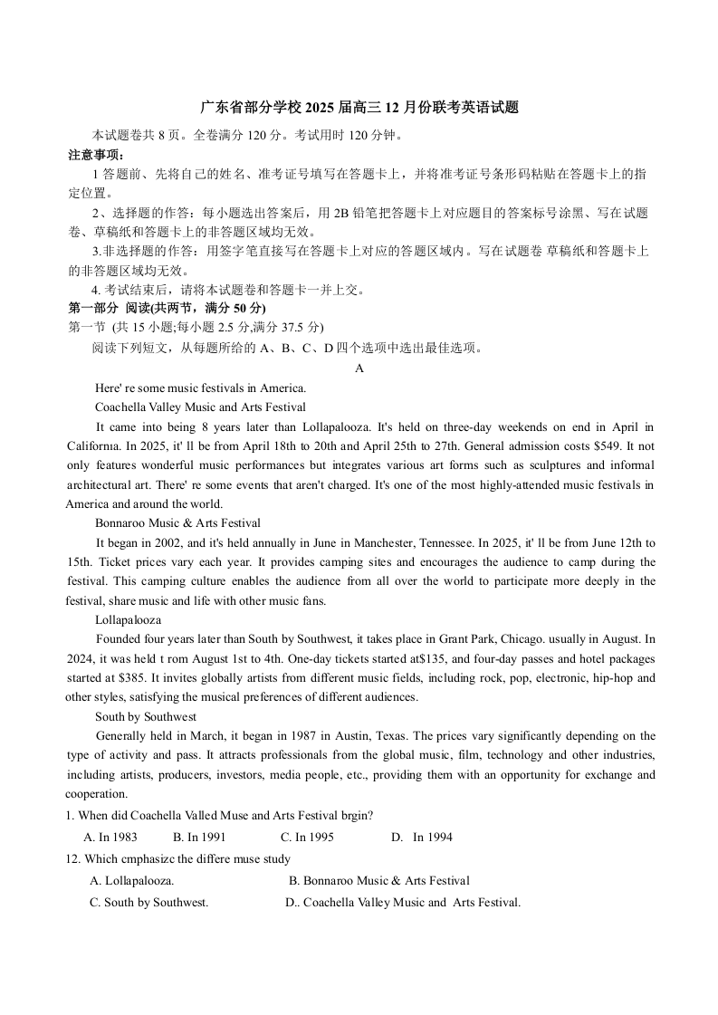 广东省区域高中2025届高三上学期12月联考英语+答案