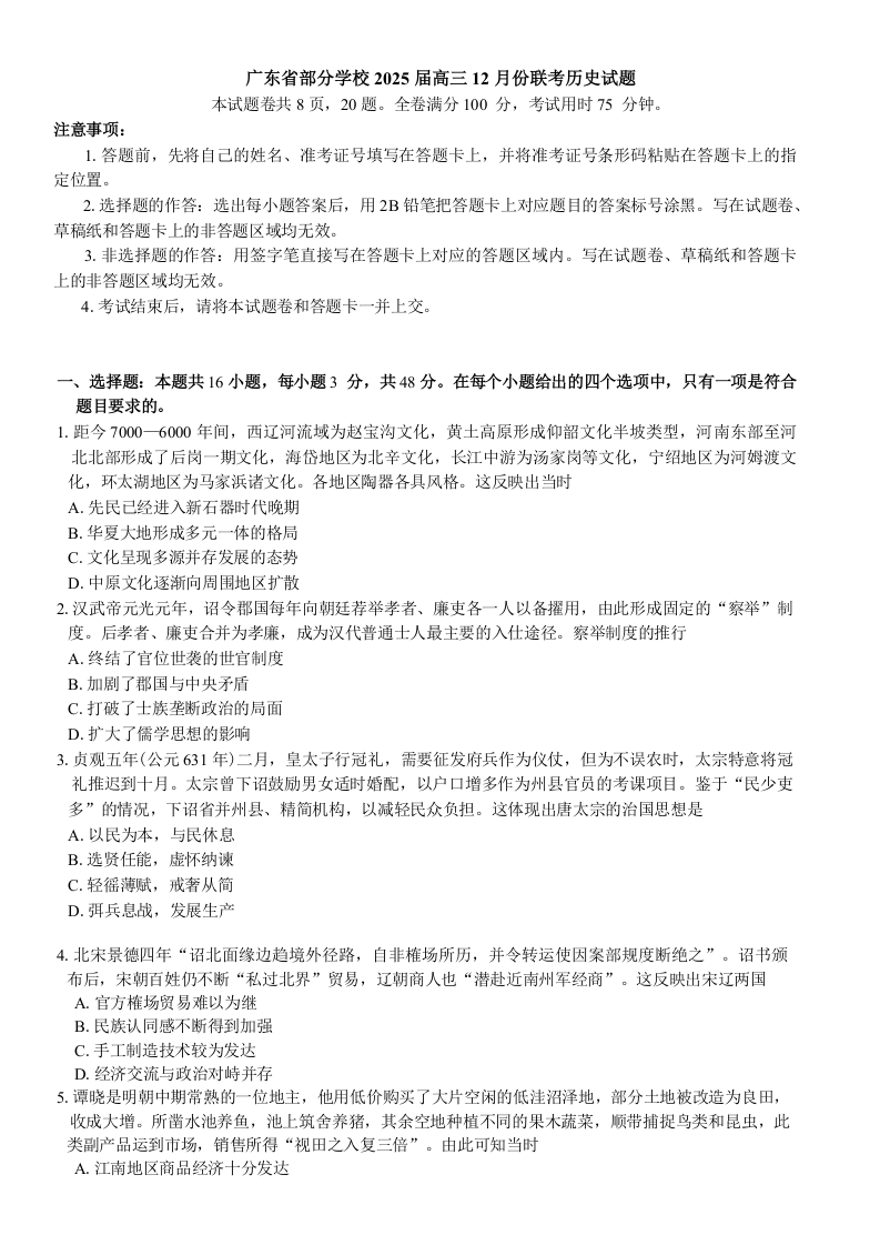 广东省区域高中2025届高三上学期12月联考历史+答案