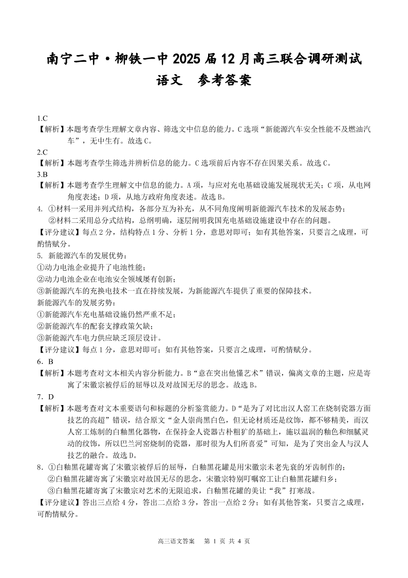 广西省考阅评•大联考南宁二中•柳铁一中2025届12月高三联合调研测试语文答案