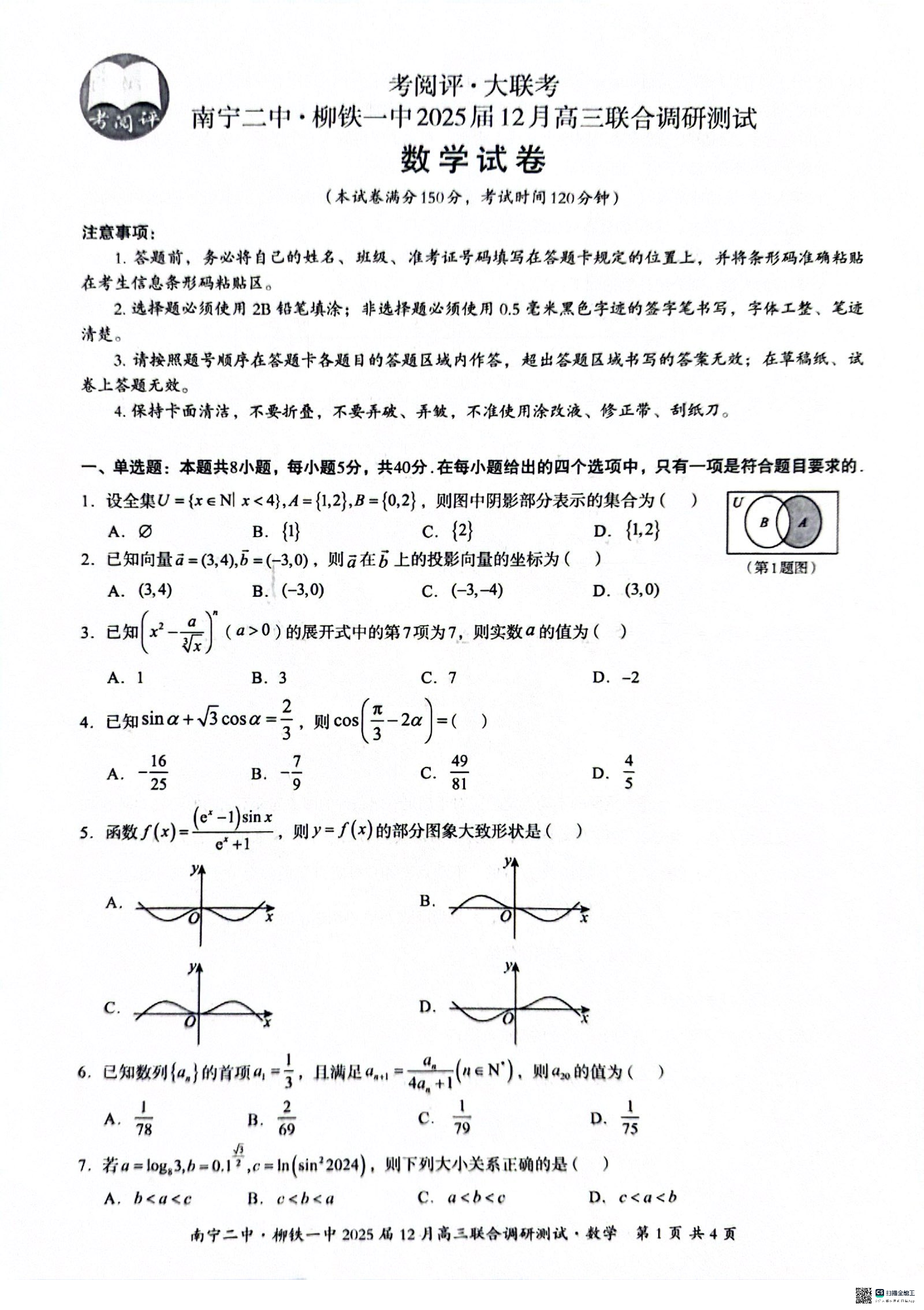广西省考阅评•南宁二中•柳铁一中2025届12月高三联合调研测试数学