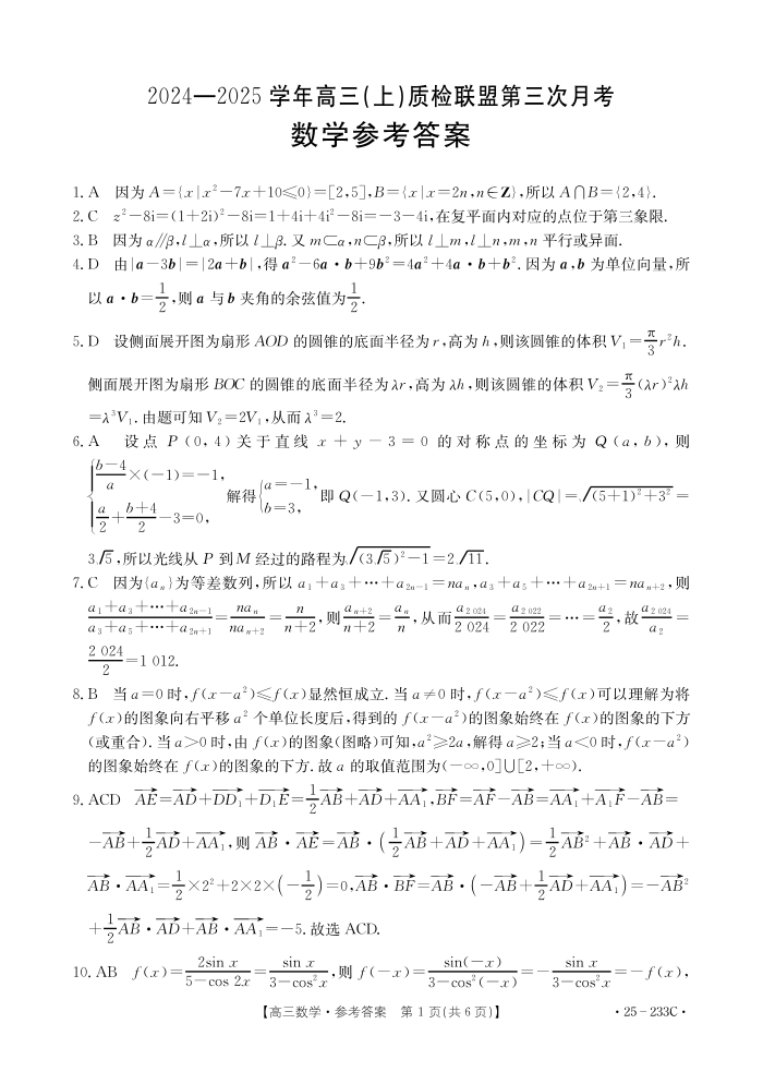 河北省质检联盟2024-2025学年高三上学期第三次月考数学答案
