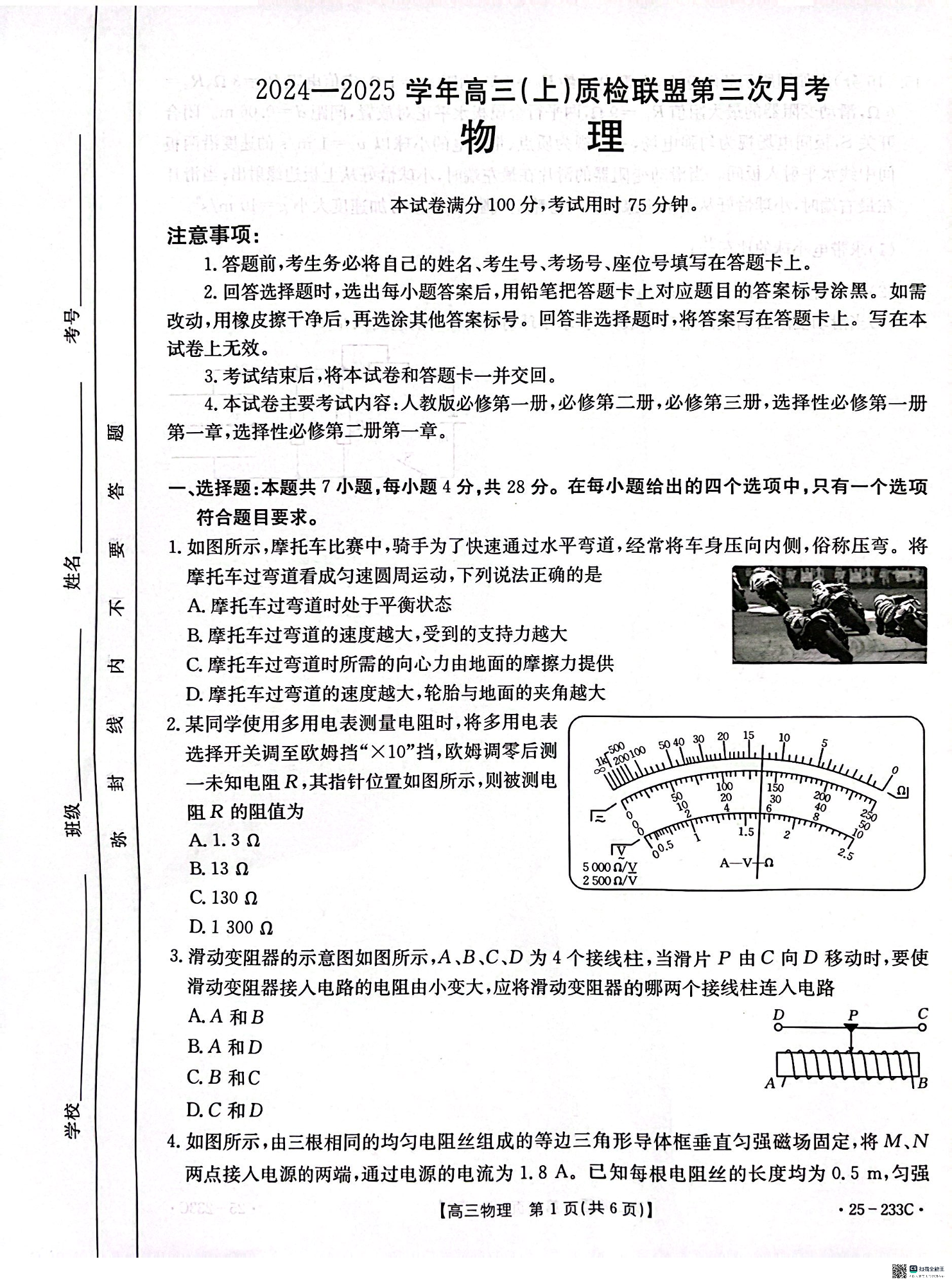 河北省质检联盟2024-2025学年高三上学期第三次月考物理