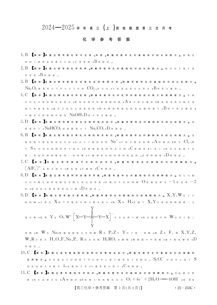 河北省质检联盟2024-2025学年高三上学期第三次月考化学答案