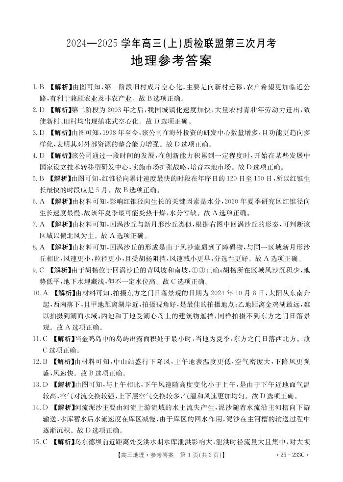 河北省质检联盟2024-2025学年高三上学期第三次月考地理答案