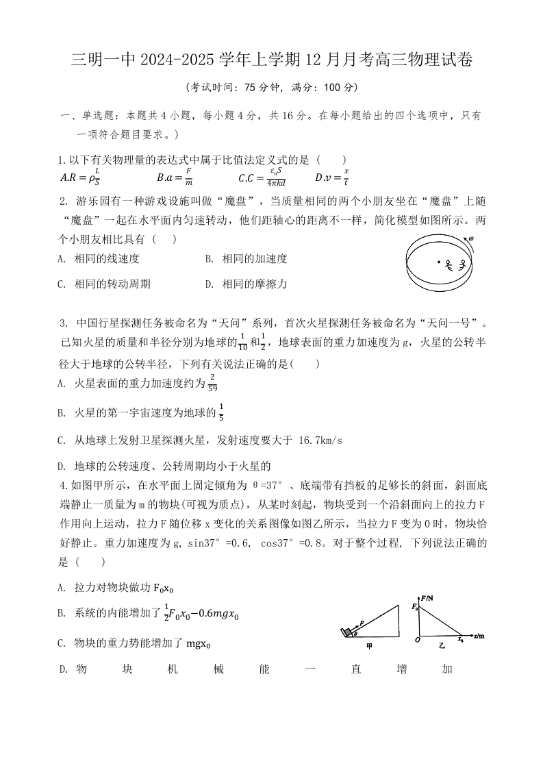 福建省三明市第一中学2025届高三上学期12月月考物理+答案