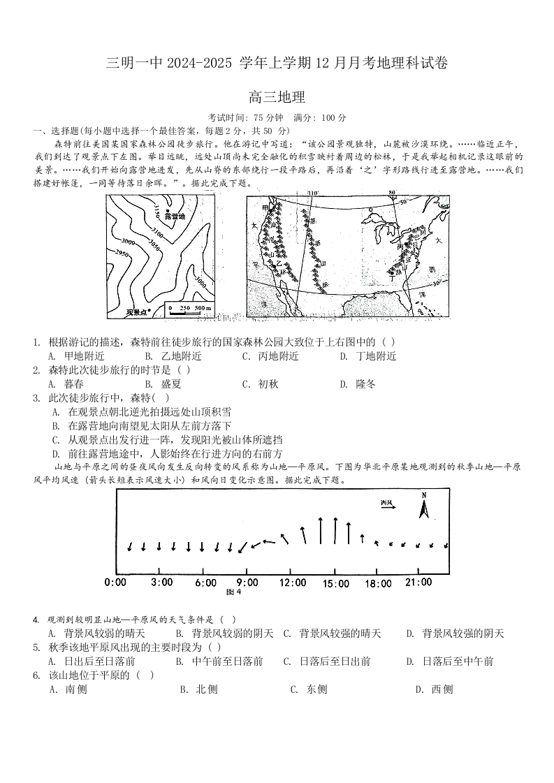 福建省三明市第一中学2025届高三上学期12月月考地理+答案
