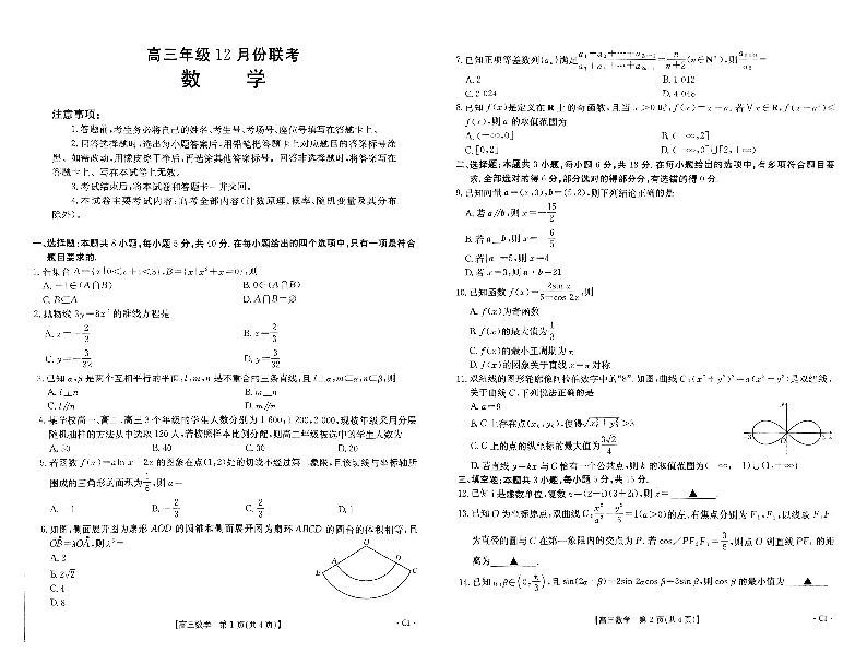 河北省保定市十县一中2025届高三上学期12月联考试题数学