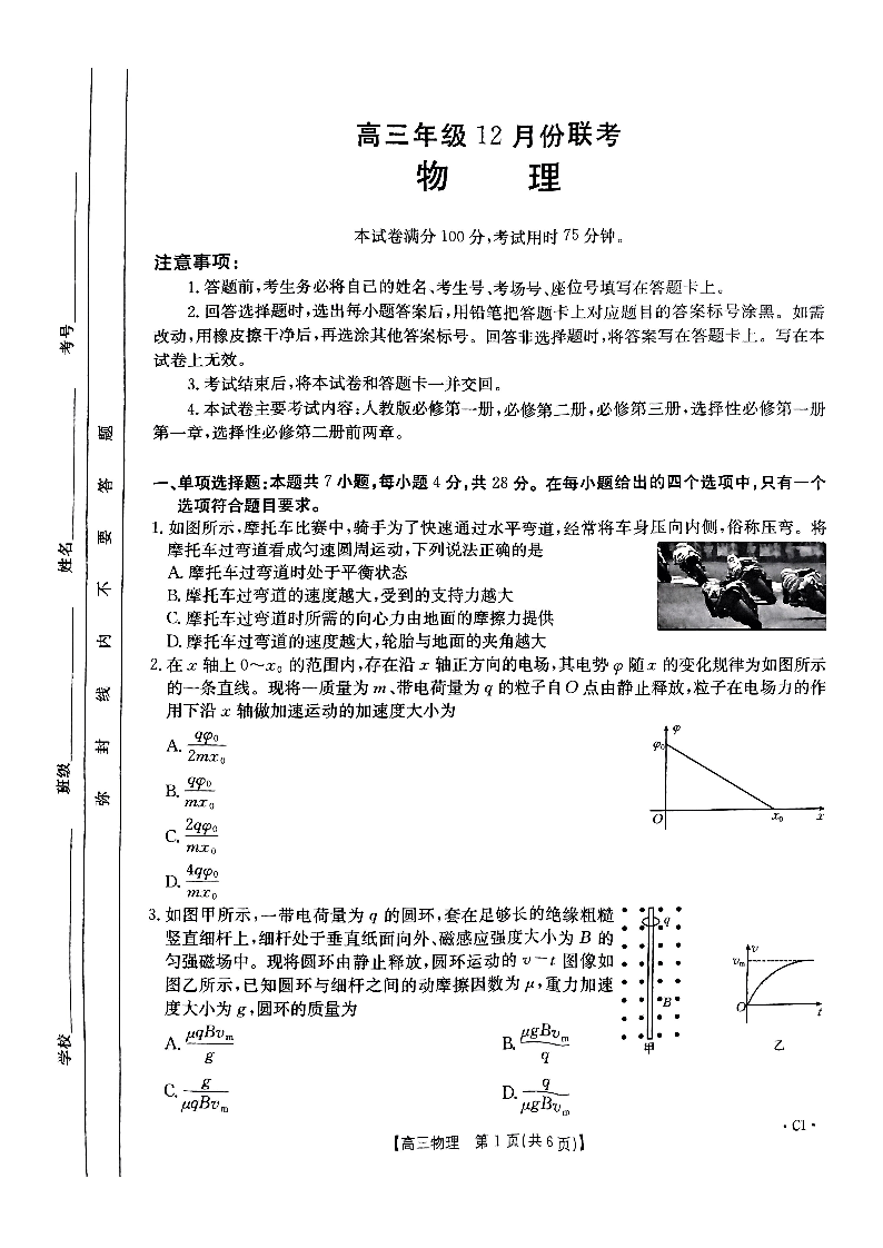 河北省保定市十县一中2025届高三上学期12月联考试题物理