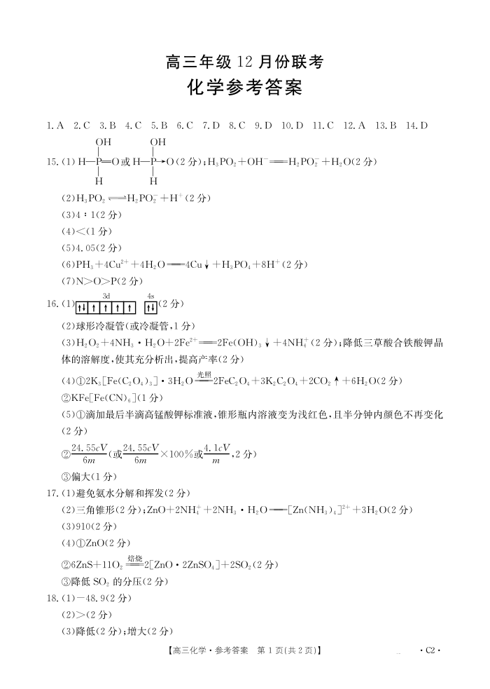 河北省保定市十县一中2025届高三上学期12月联考试题化学答案