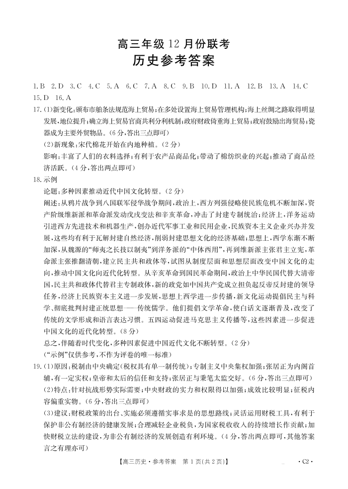 河北省保定市十县一中2025届高三上学期12月联考试题历史答案