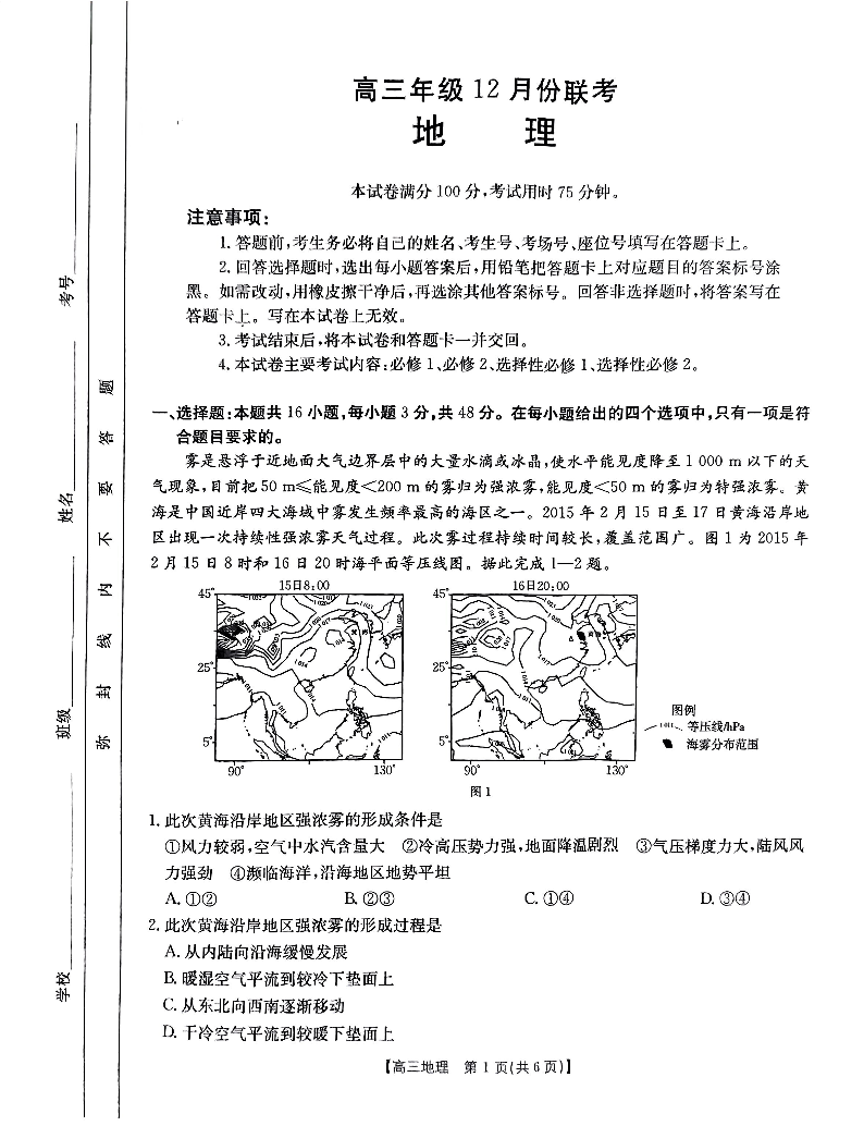 河北省保定市十县一中2025届高三上学期12月联考试题地理