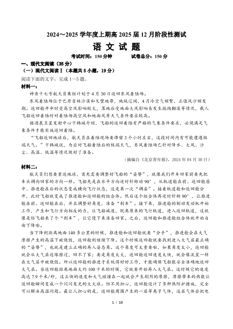 四川省成都市第七中学2025届高三上学期12月阶段性考试语文
