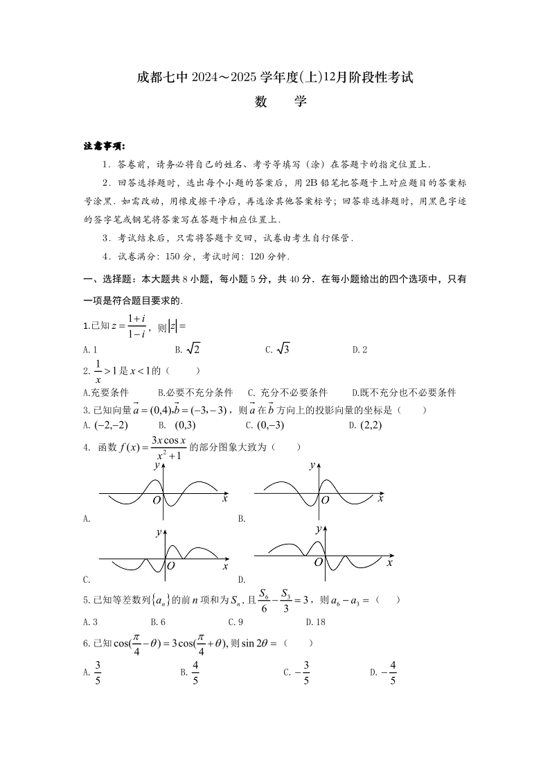 四川省成都市第七中学2025届高三上学期12月阶段性考试数学