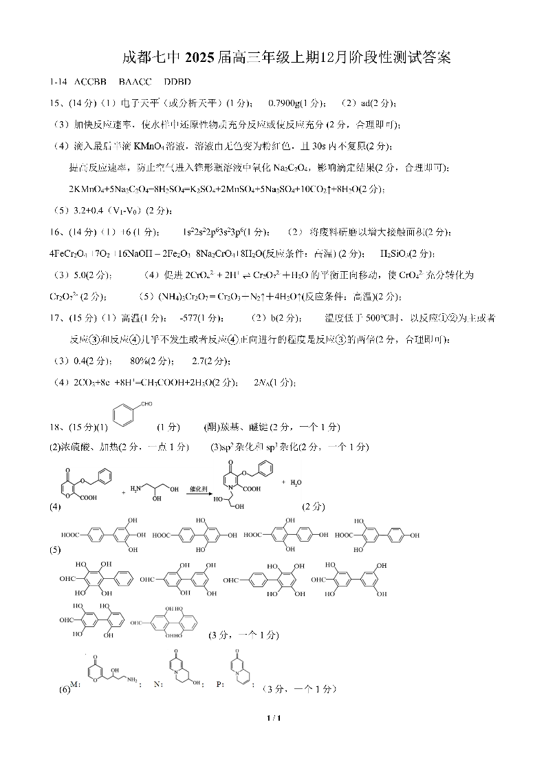 四川省成都市第七中学2025届高三上学期12月阶段性考试化学答案