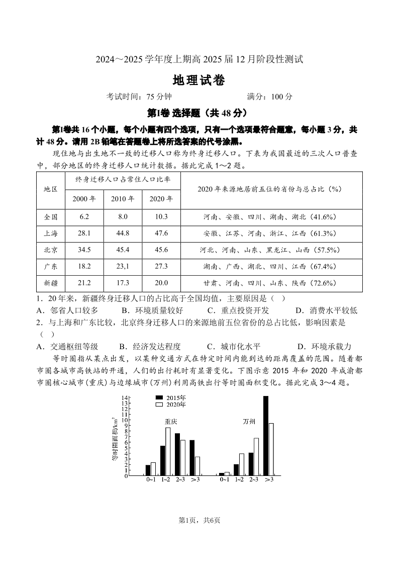 四川省成都市第七中学2025届高三上学期12月阶段性考试地理