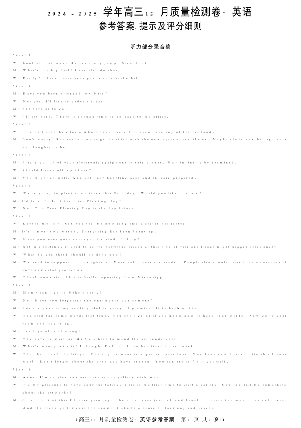山西省卓越联盟区域高中2025届高三12月质量检测英语答案