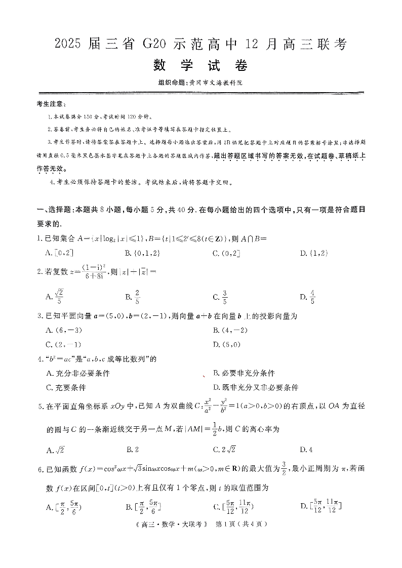 豫赣疆三省G20示范高中2025届高三上学期12月联考数学