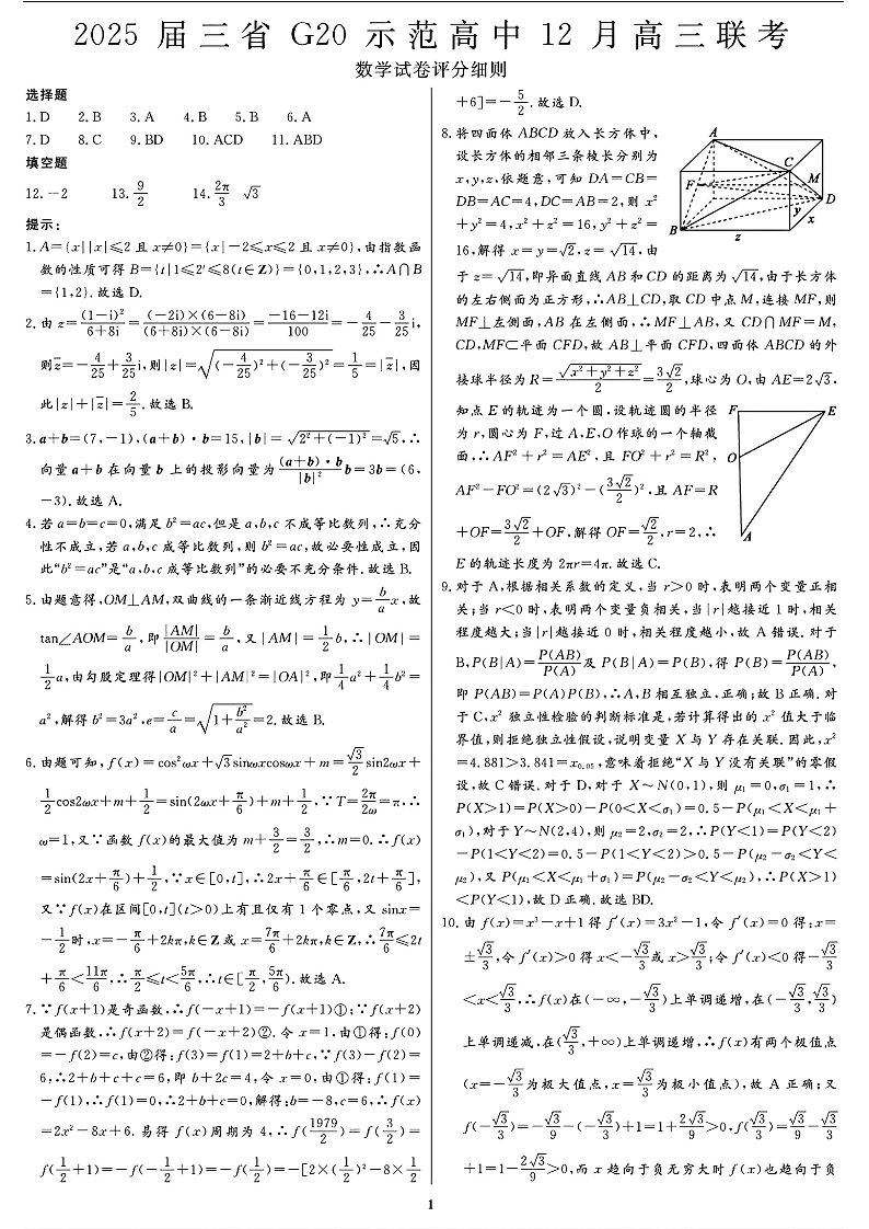 豫赣疆三省G20示范高中2025届高三上学期12月联考数学答案