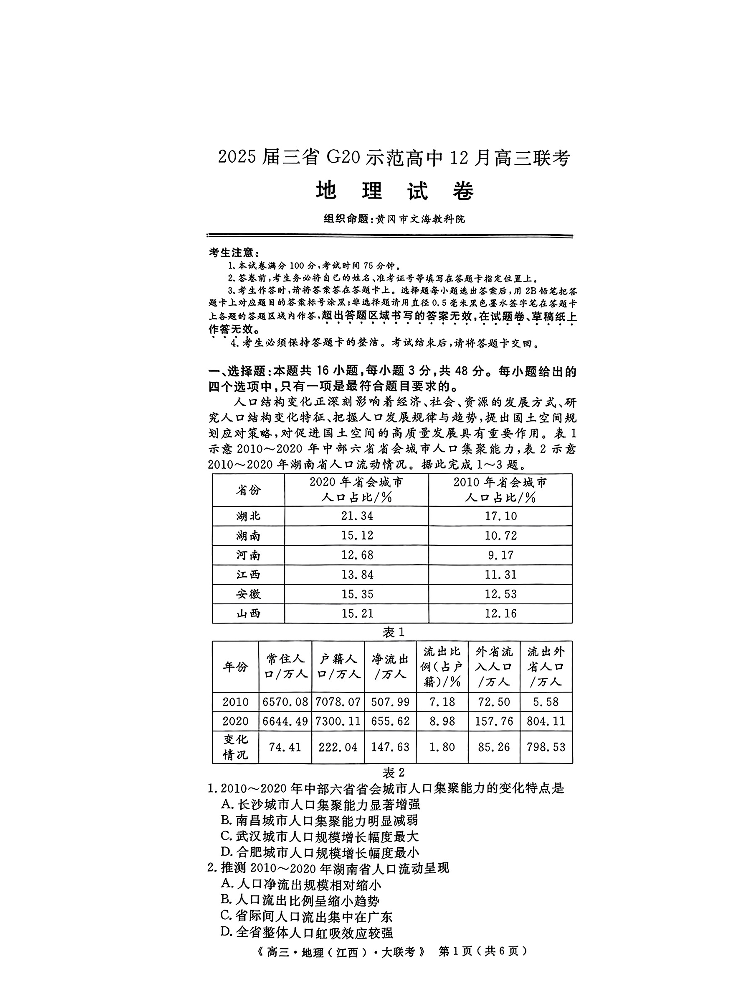 豫赣疆三省G20示范高中2025届高三上学期12月联考地理+答案