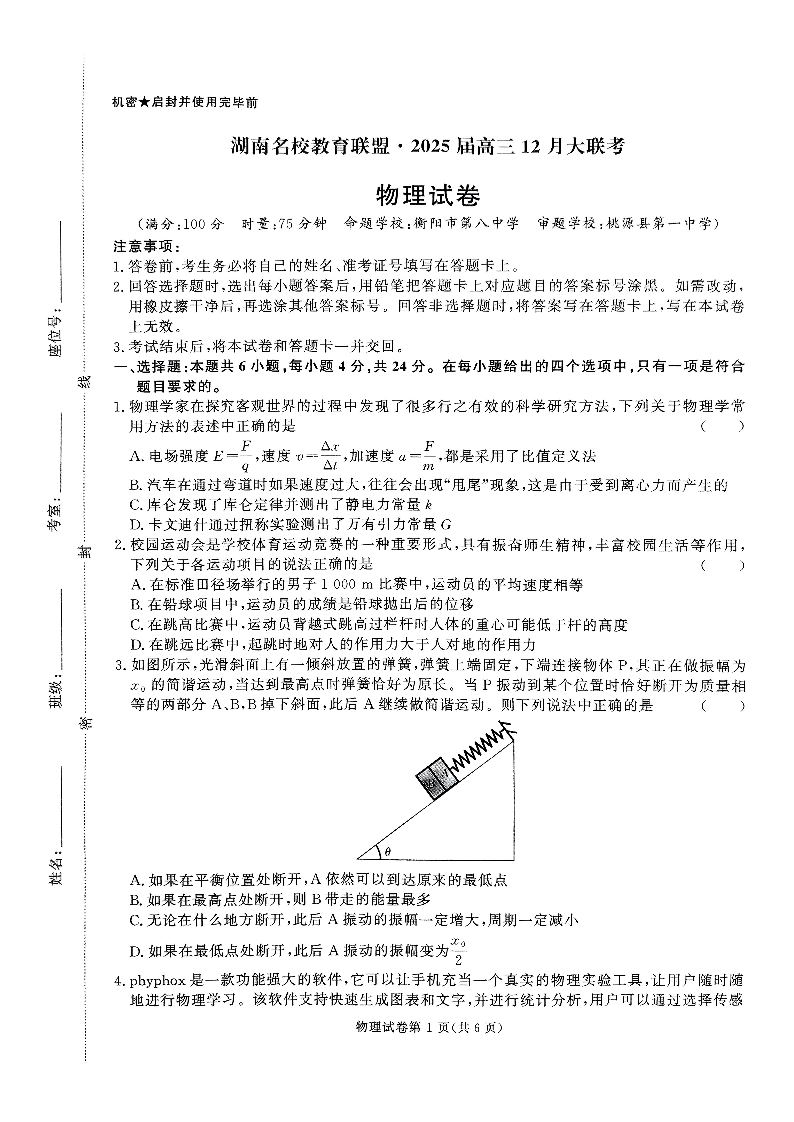 湖南省名校教育联盟2025届高三上学期12月大联考物理