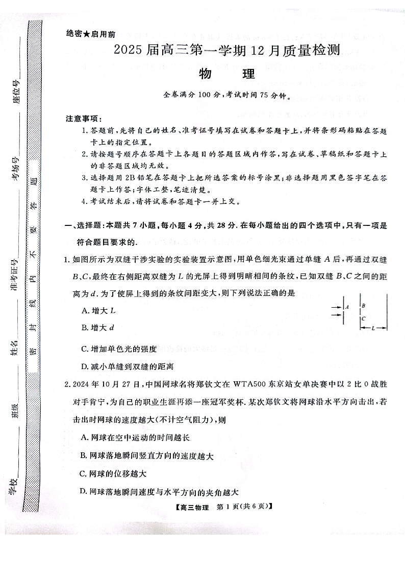 河南省华师联盟2025届高三第一学期12月质量检测物理
