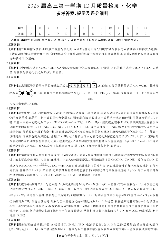 河南省华师联盟2025届高三第一学期12月质量检测化学答案