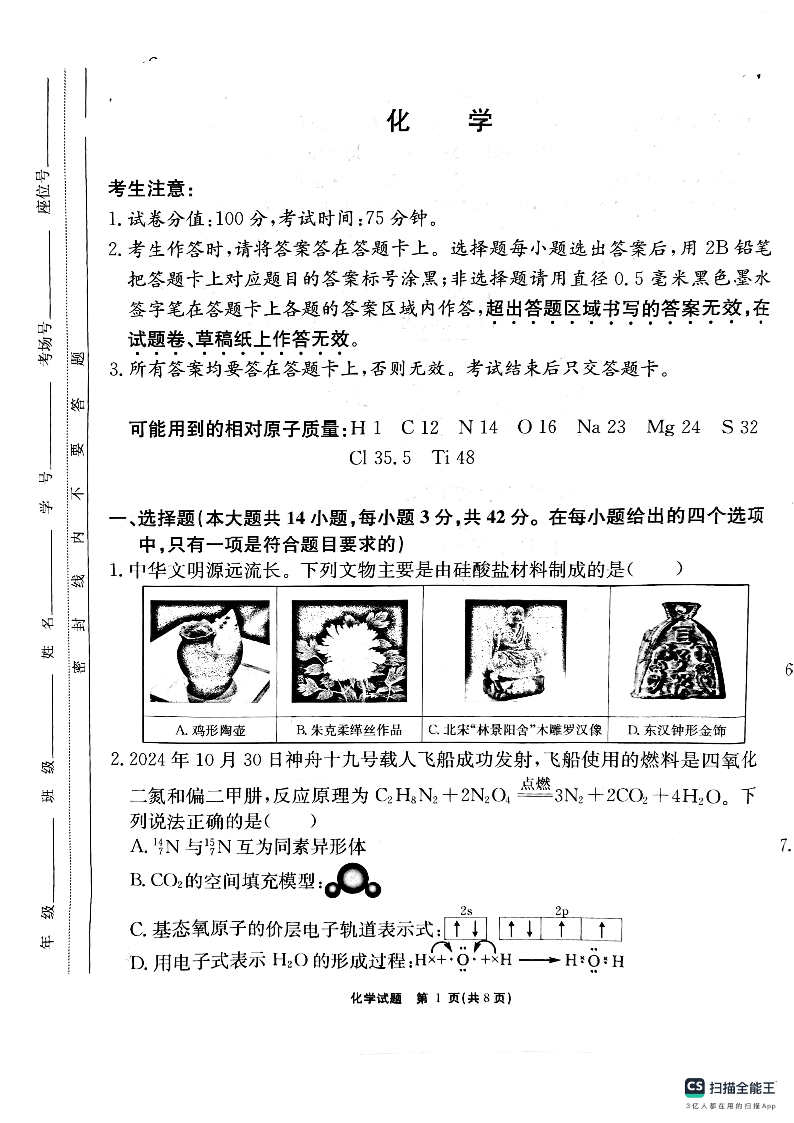 安徽省师大附中等名校2025届高三年级12月阶段性联考检测化学