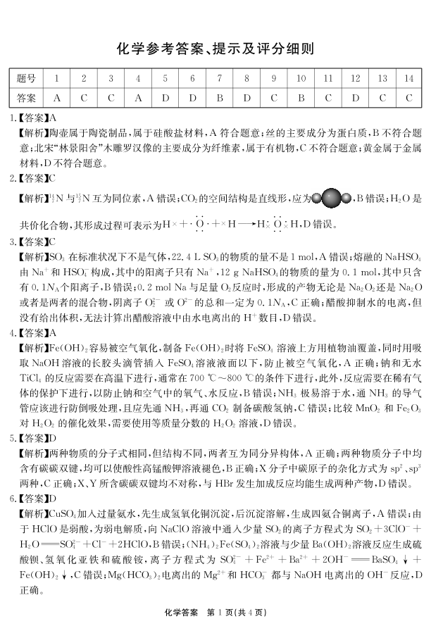 安徽省师大附中等名校2025届高三年级12月阶段性联考检测化学答案