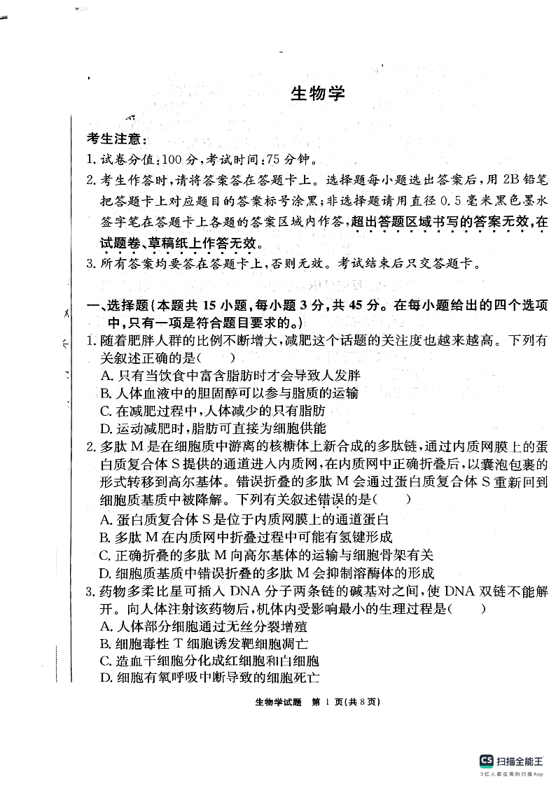 安徽省师大附中等名校2025届高三年级12月阶段性联考检测生物学
