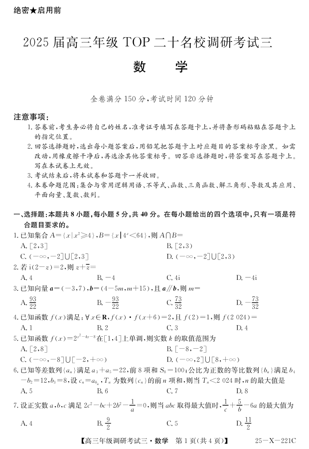 河南省TOP二十名校2025届高三上学期调研考试(三)数学