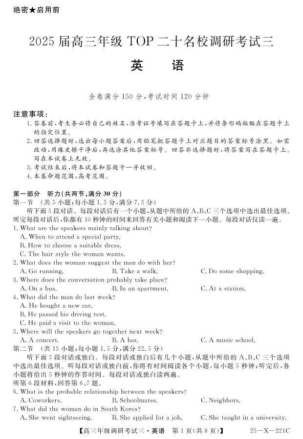 河南省TOP二十名校2025届高三上学期调研考试(三)英语