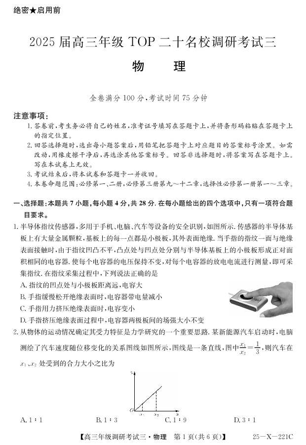河南省TOP二十名校2025届高三上学期调研考试(三)物理