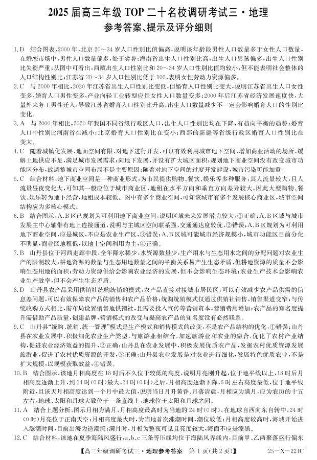 河南省TOP二十名校2025届高三上学期调研考试(三)地理答案