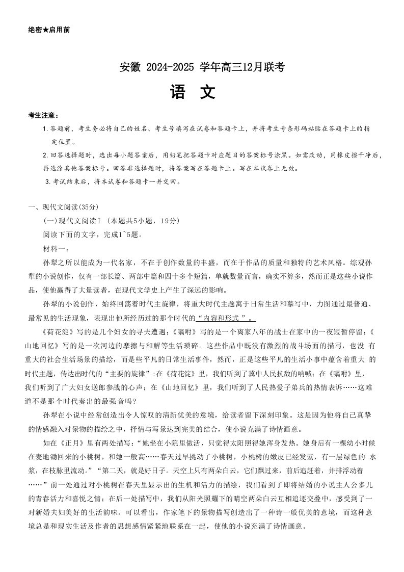 安徽省区域高中2025届上学期高三年级12月联考语文