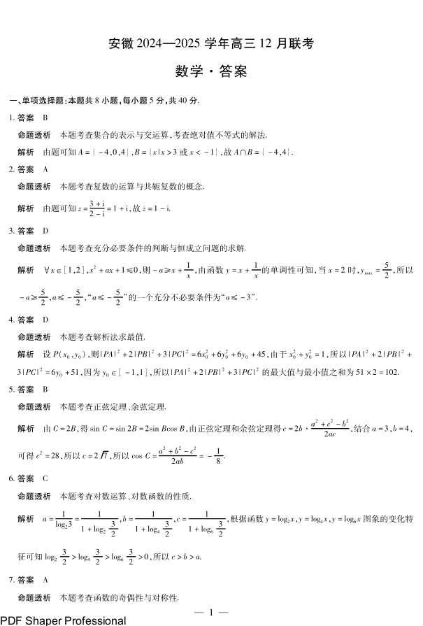 安徽省区域高中2025届上学期高三年级12月联考数学答案