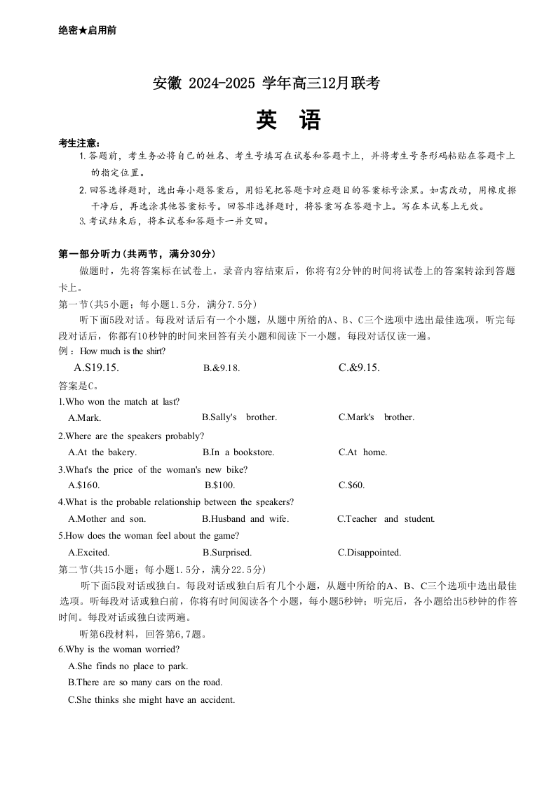 安徽省区域高中2025届上学期高三年级12月联考英语