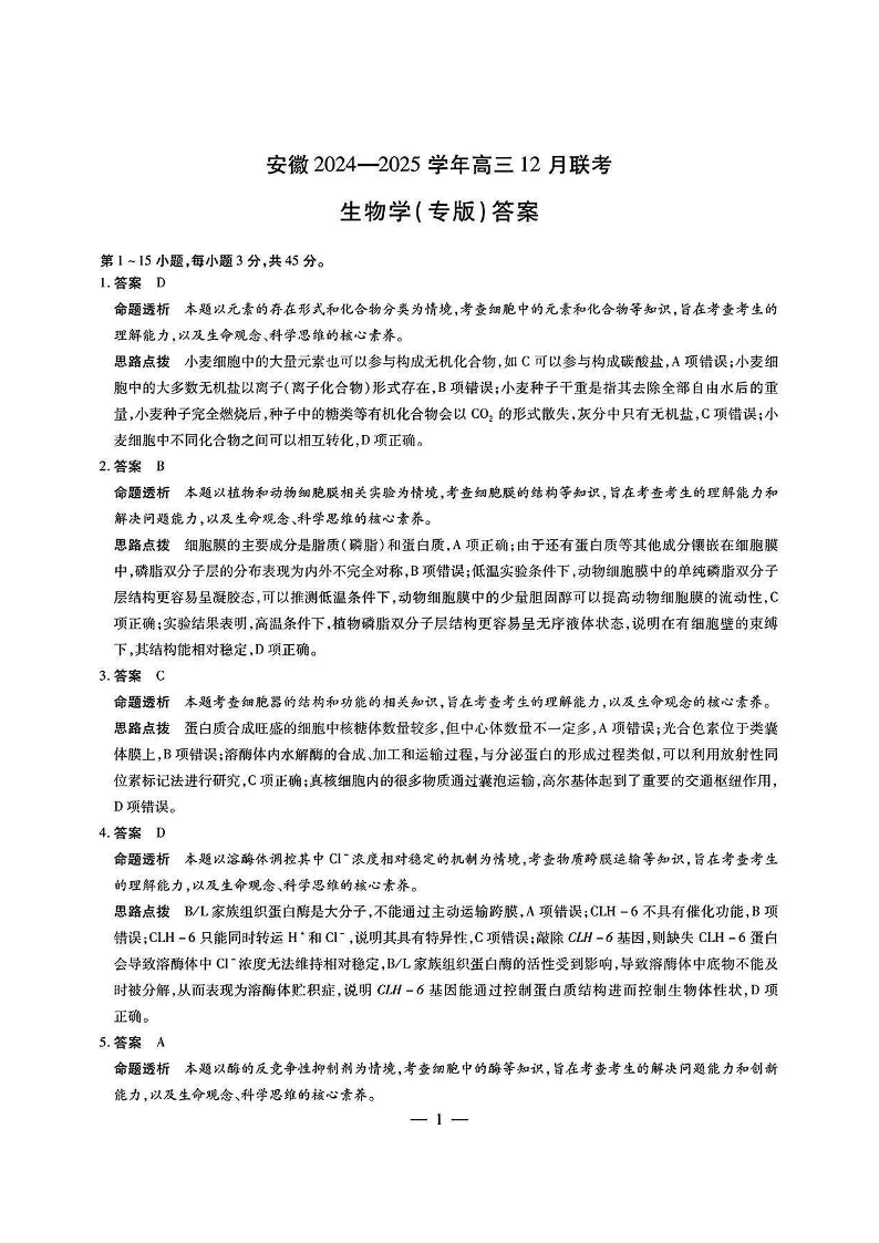 安徽省区域高中2025届上学期高三年级12月联考生物答案