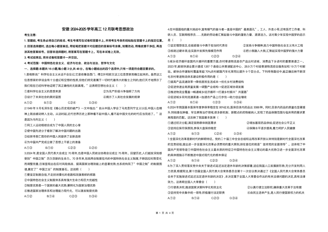 安徽省区域高中2025届上学期高三年级12月联考政治