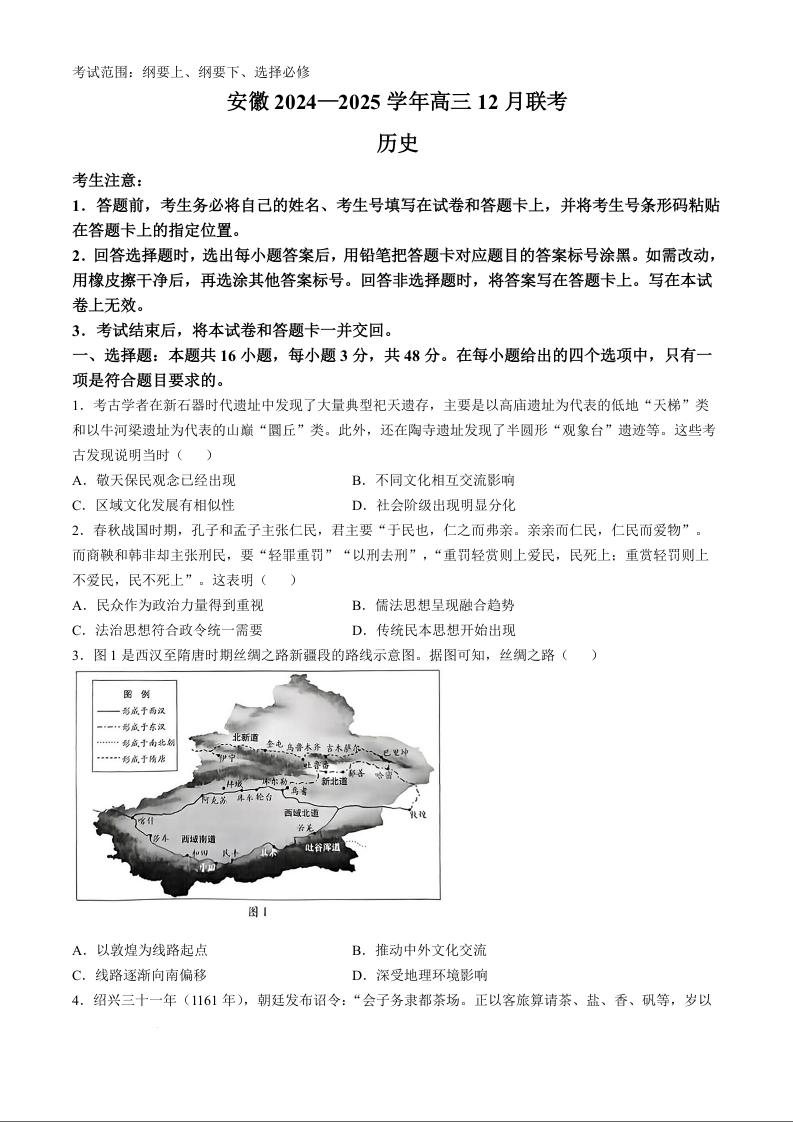 安徽省区域高中2025届上学期高三年级12月联考历史+答案