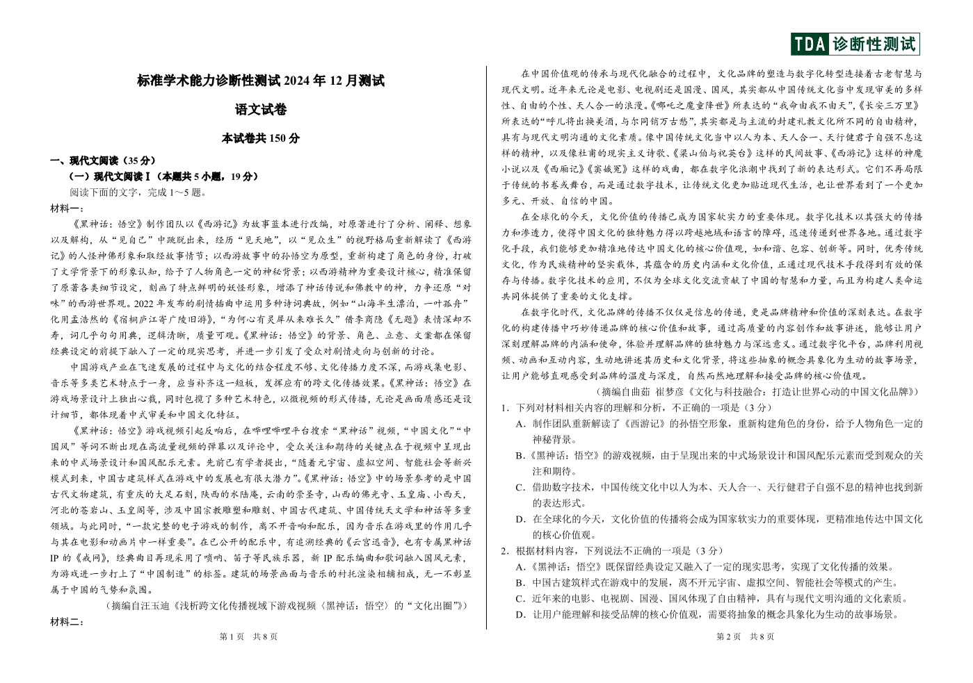 全国中学生标准学术能力诊断性测试2025届高三上学期12月月考语文+答案