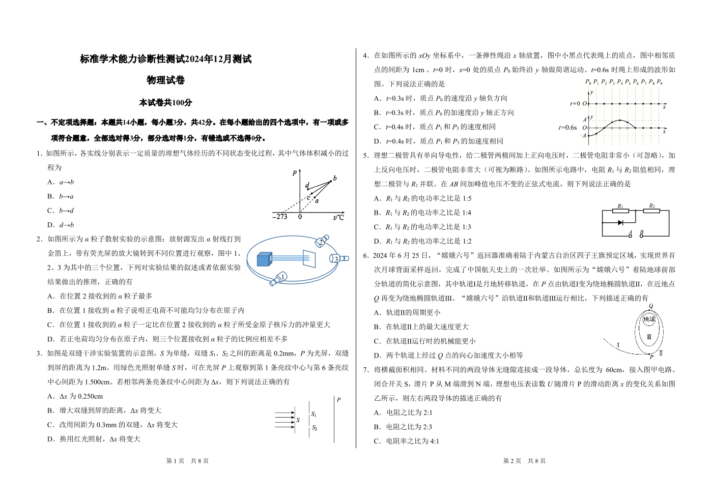 全国中学生标准学术能力诊断性测试2025届高三上学期12月月考物理+答案