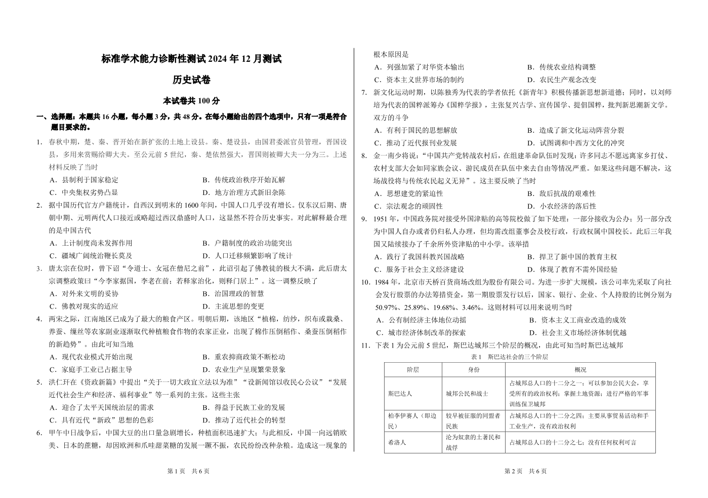 全国中学生标准学术能力诊断性测试2025届高三上学期12月月考历史+答案