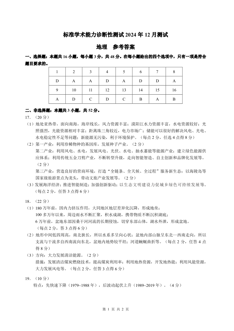 全国中学生标准学术能力诊断性测试2025届高三上学期12月月考地理答案