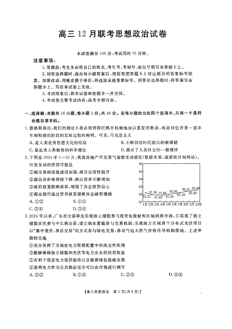 广东、福建两省跨区域高中2025届高三年级12月联考政治+答案