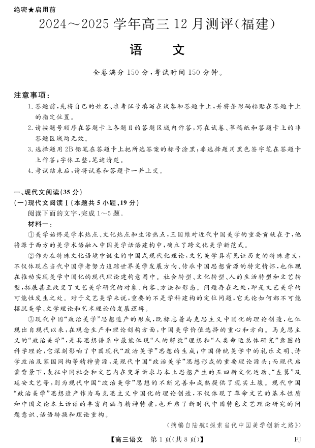 福建省金科大联考2025届上学期高三年级12月测评语文