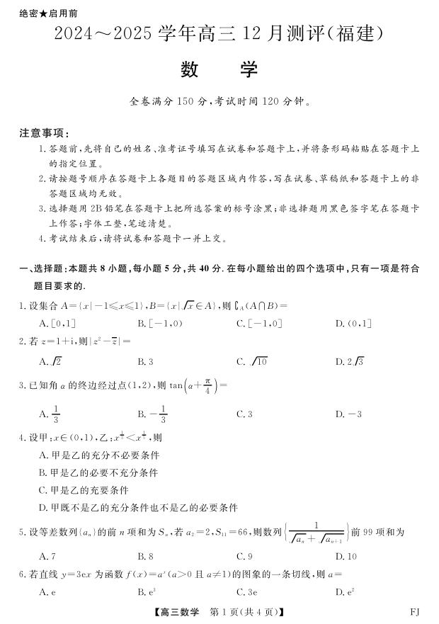 福建省金科大联考2025届上学期高三年级12月测评数学
