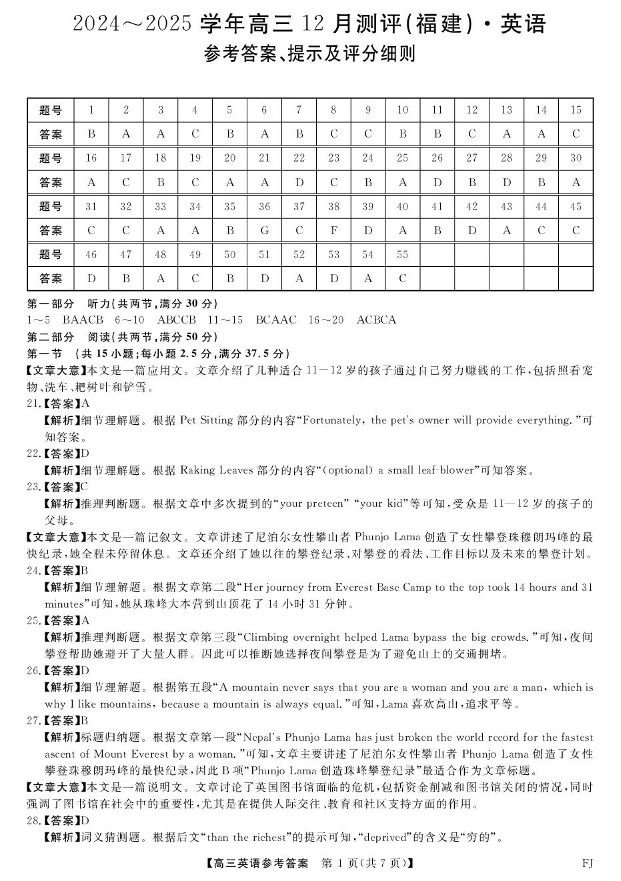 福建省金科大联考2025届上学期高三年级12月测评英语答案