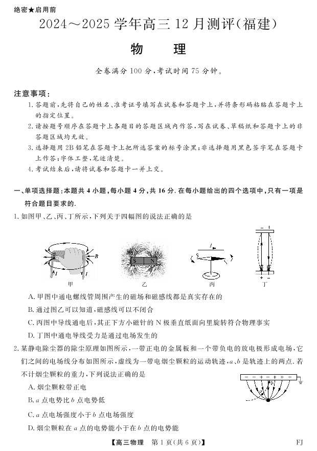 福建省金科大联考2025届上学期高三年级12月测评物理