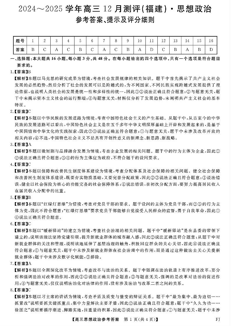 福建省金科大联考2025届上学期高三年级12月测评政治答案