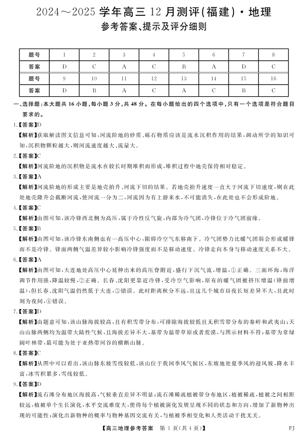 福建省金科大联考2025届上学期高三年级12月测评地理答案